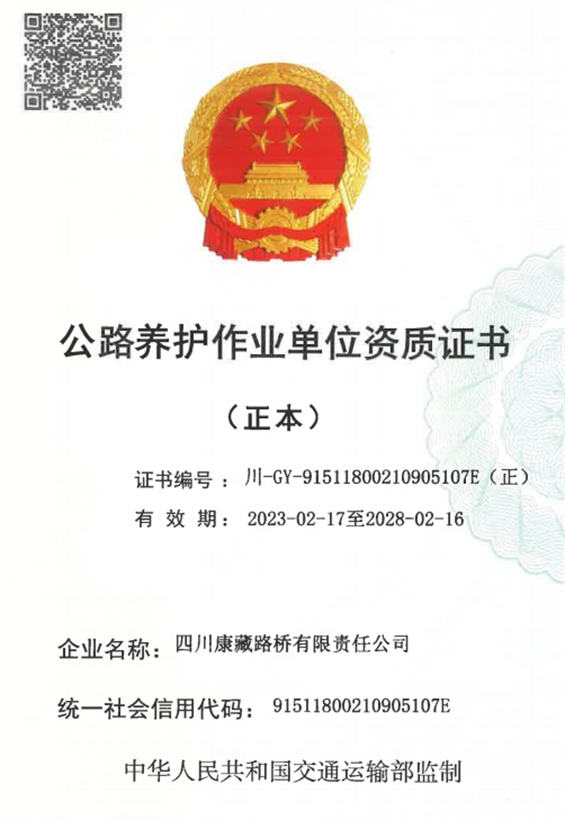 日前,四川康藏路桥有限责任公司成功顺利获得四川省交通运输厅资质申报评审,顺利取得路基路面养护乙级资质证书,成为现在雅安唯一取得此养护资质的作业单位。