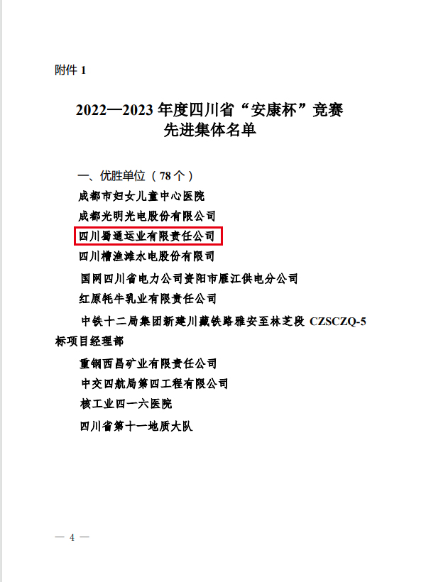 日前,省总工会、省应急管理厅、省卫健委联合发文表扬2022-2023年度四川省“安康杯”竞赛先进集体和先进个人,蜀通公司被评为“优胜单位”。