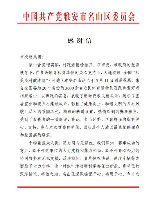 5月10日至11日,以“心向和美 逐梦茶源”为主题的大地流彩·2025年全国和美乡村健康跑(村跑)雅安名山站活动在雅安市名山区成功举办。四川蜀通运业有限责任公司作为运输保障单位,圆满完成赛事期间各项运输保障任务,为活动的顺利召开给予了坚实保障,受到名山区委、区政府感谢信。