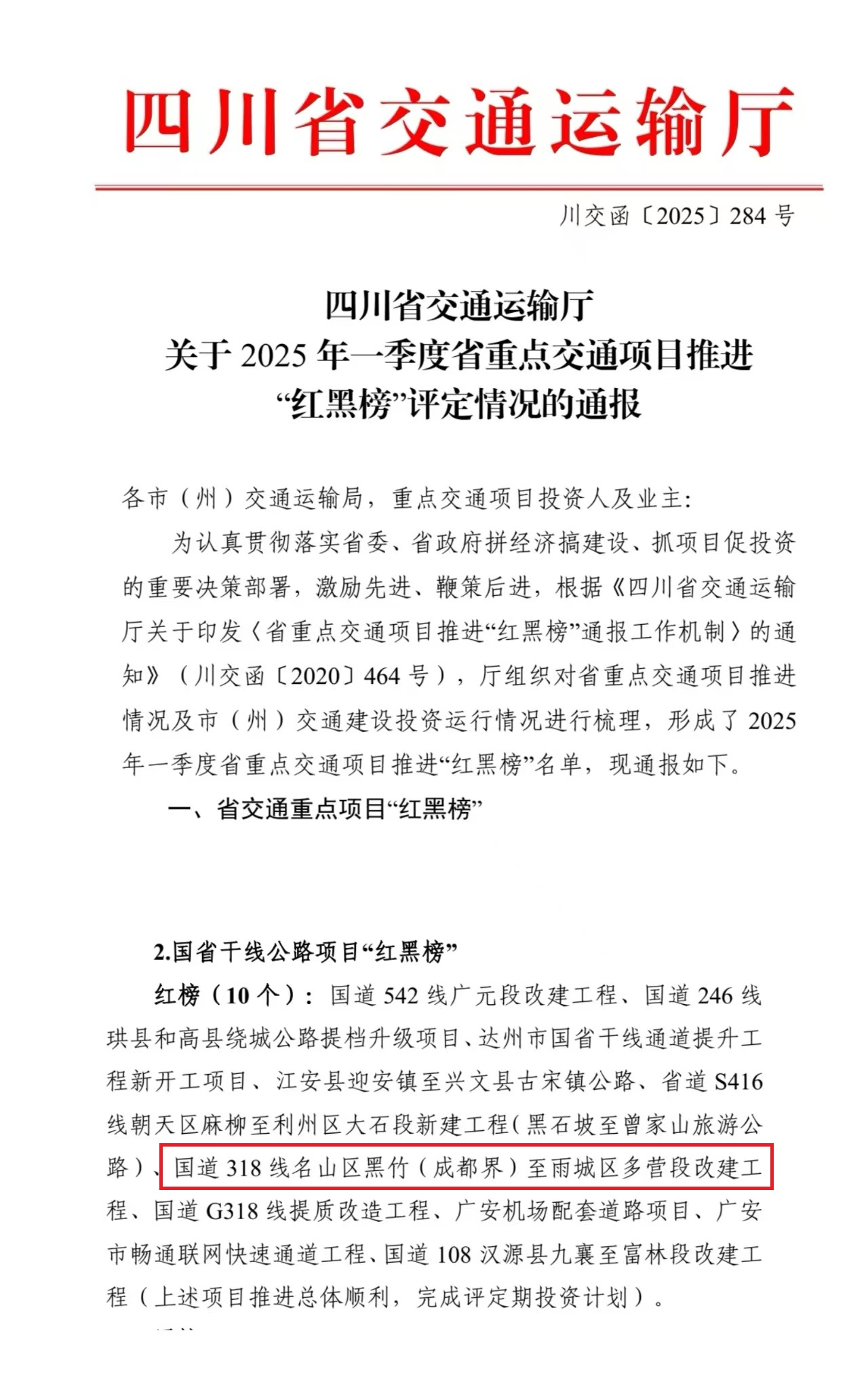 近期,四川省交通运输厅发布2025年一季度省重点交通项目推进“红黑榜”评选结果,由币游集团四川康藏路桥有限责任公司承建的国道318线名山区黑竹(成都界)至雨城区多营段改建工程凭借超额完成投资计划、关键节点取得突破等成效,成功入选国省干线公路项目“红榜”。