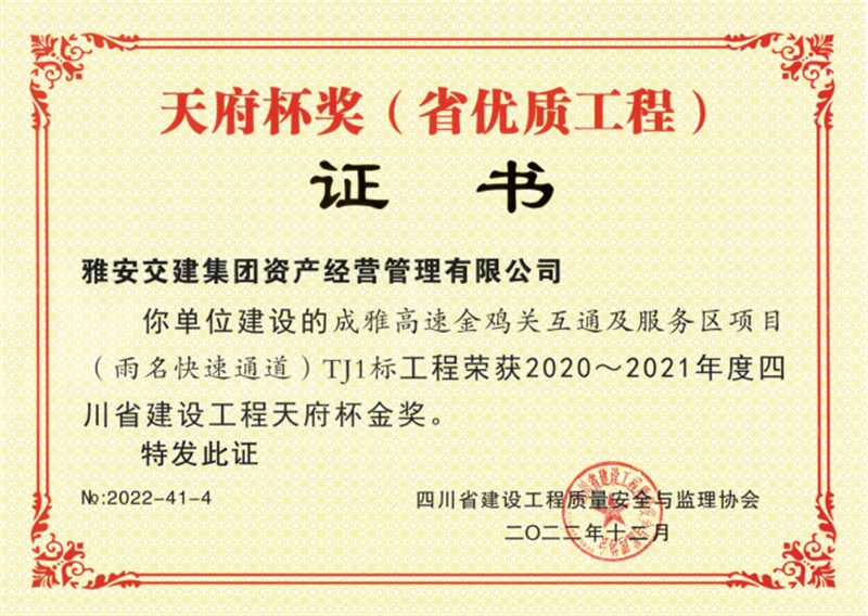 近期,币游集团资产经营管理有限公司建设的成雅高速金鸡关互通及服务区项目(雨名快速通道)TJ1标工程荣获2020-2021年度四川省建设工程天府杯金奖。