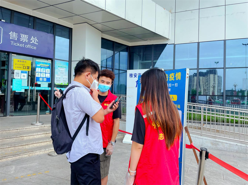 “您好,请打开天府健康通出示您的健康码和行程码,并扫描场所码,感谢配合”,志愿者们不厌其烦地重复引导语,将旅客们有序的引导入站;对于无法熟练使用智能手机的旅客,交建集团青年志愿者主动上前操作,一步步帮助他们完成信息登记工作,筑牢了旅客出行的第一张“安全网”。