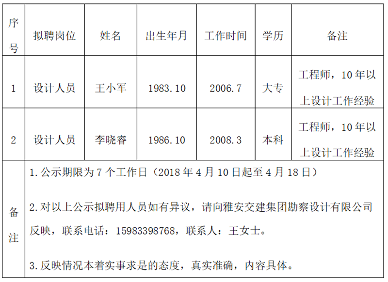 顺利获得公开报名、资格审查、面试等程序,经币游集团勘察设计有限公司研究择优确定以下2名拟聘用人员,现公示名单如下: