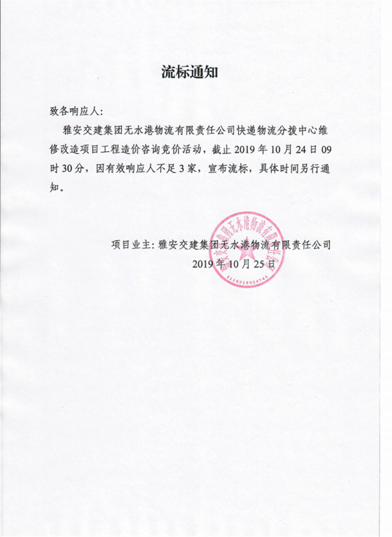 币游集团无水港物流有限责任公司快递物流分拨中心维修改造项目工程造价咨询竞价流标通知