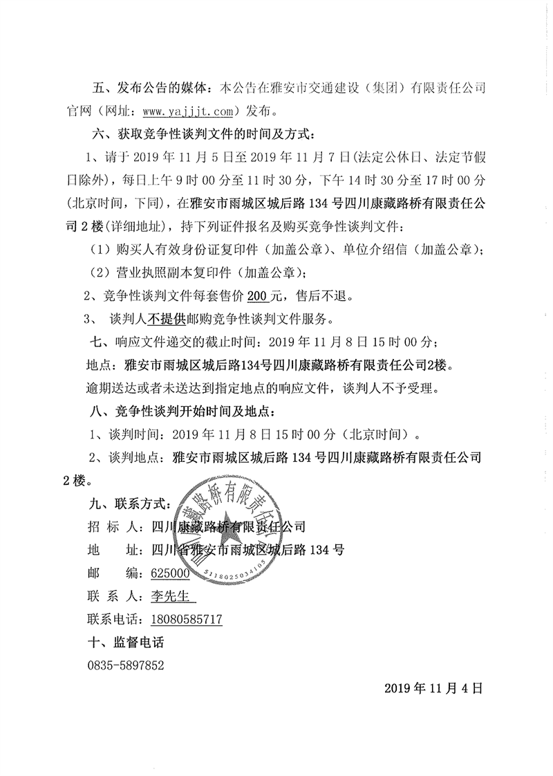 四川康藏路桥有限责任公司省道104线草坝至姚桥段改建工程项目部驻地板房采购竞争性谈判(第二次)公告