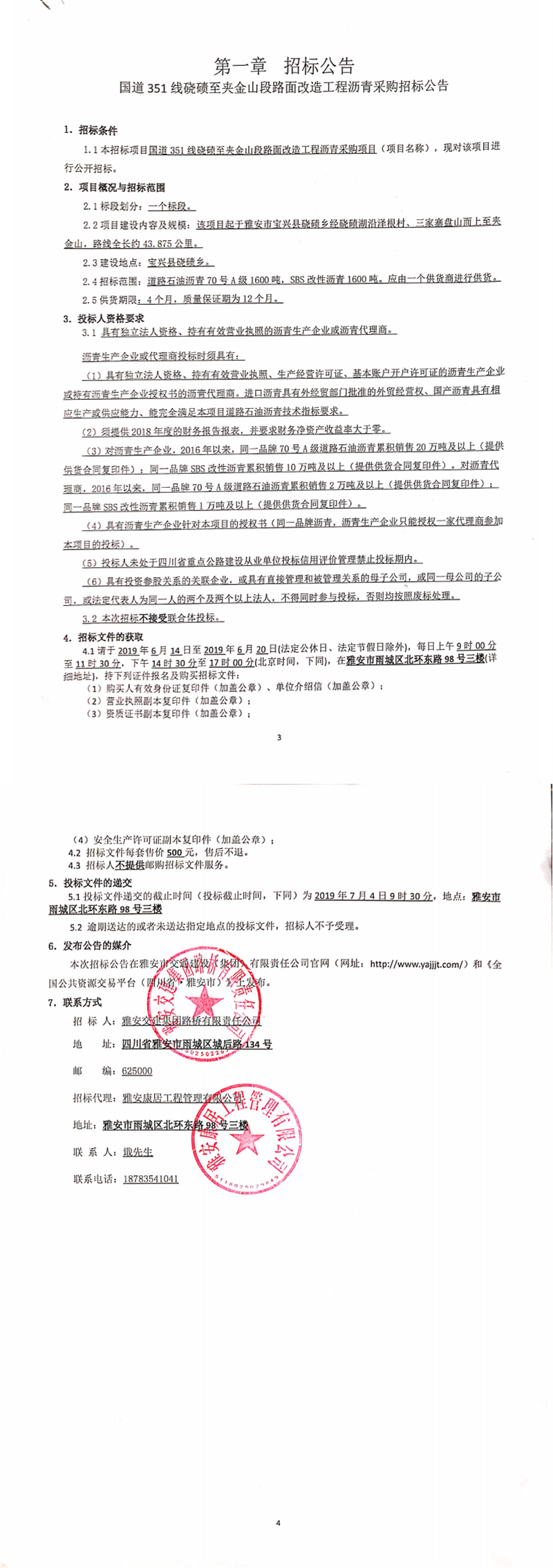 币游集团路桥有限责任公司国道351线硗碛至夹金山段路面改造工程沥青采购招标公告