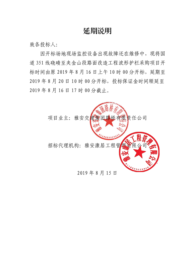 币游集团路桥有限责任公司国道351线硗碛至夹金山段路面改造工程波形护栏采购延期说明