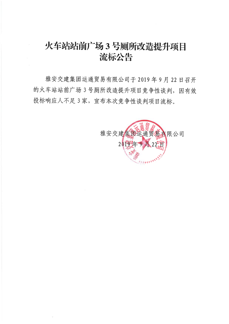 币游集团运通贸易有限公司火车站站前广场3号厕所改造提升项目流标公告