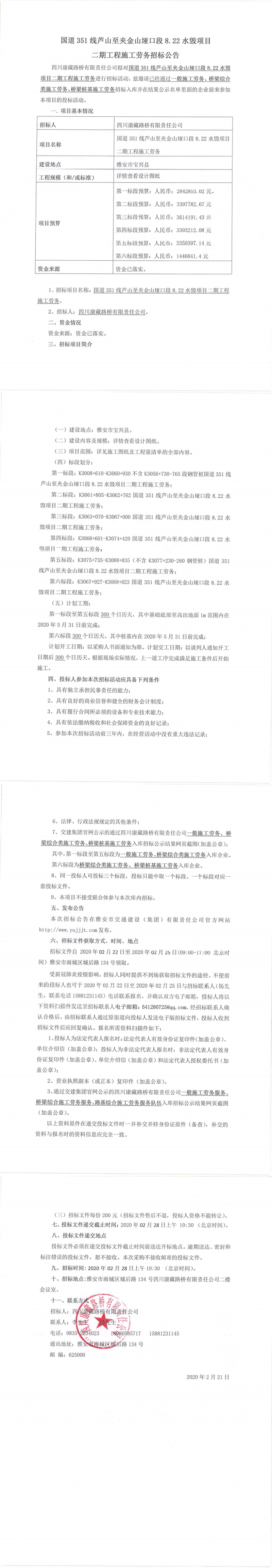 四川康藏路桥有限责任公司国道351线芦山至夹金山垭口段8.22水毁项目二期工程施工劳务招标公告