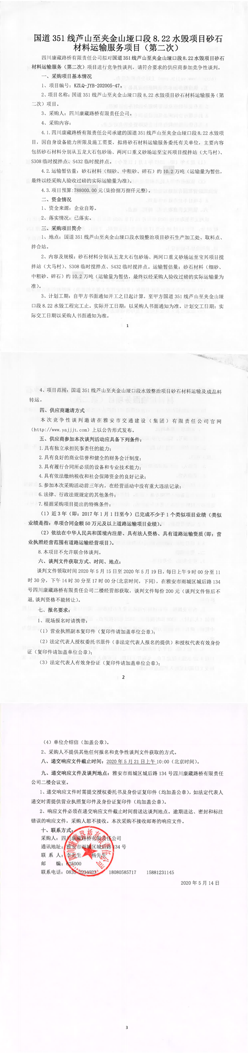 四川康藏路桥有限责任公司国道351线芦山至夹金山垭口段8.22水毁项目砂石材料运输服务项目(第二次)竞争性谈判公告