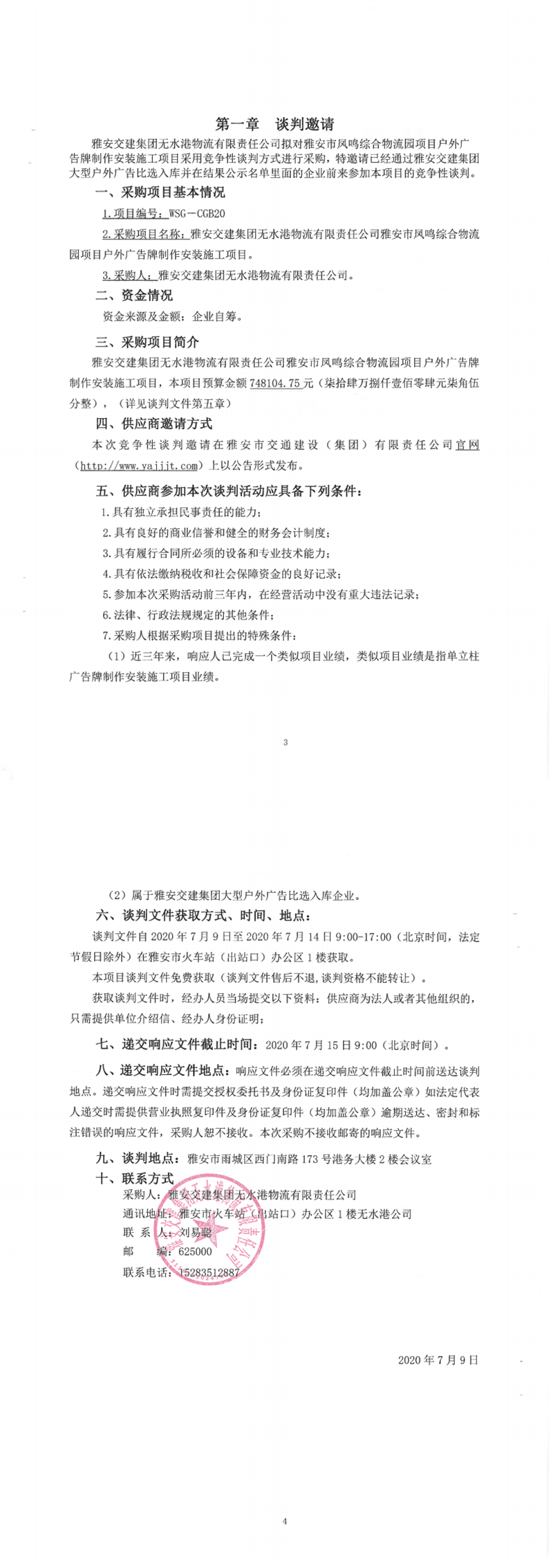 币游集团无水港物流有限责任公司雅安市凤鸣综合物流园项目户外广告牌制作安装施工项目竞争性谈判公告