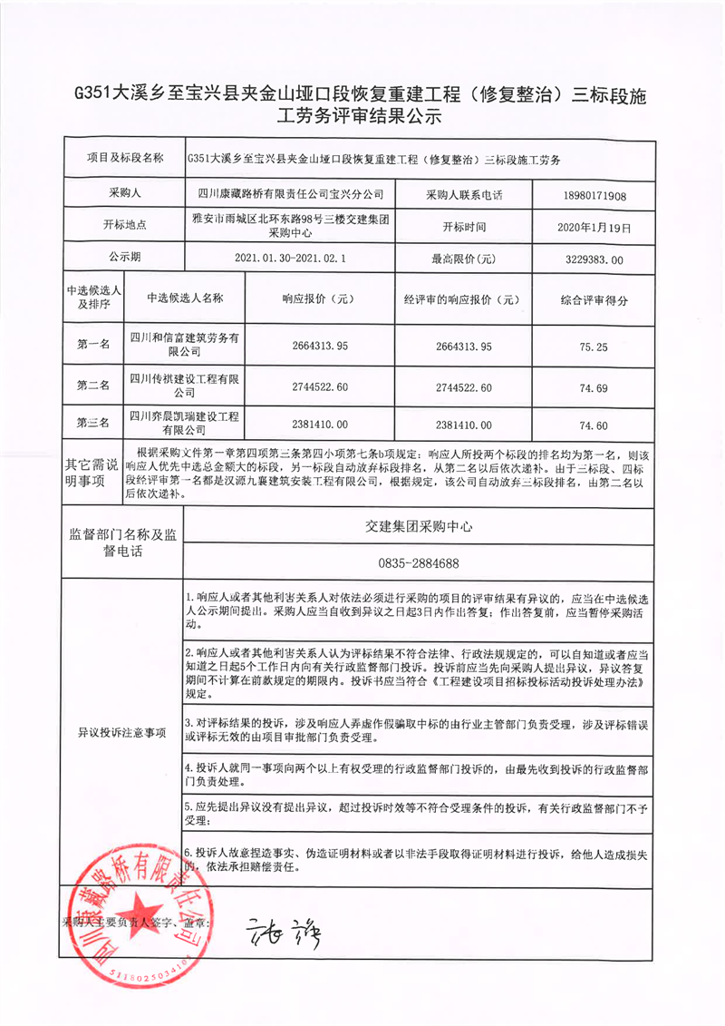 四川康藏路桥有限责任公司G351大溪乡至宝兴县夹金山垭口段恢复重建工程(修复整治)三标段施工劳务评审结果公示