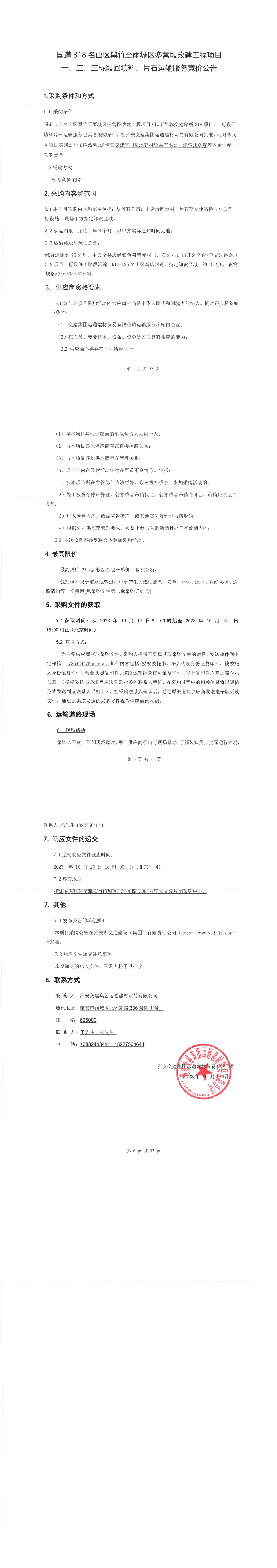 币游集团运通建材贸易有限公司国道名山区黑竹至雨城区多营段改建工程项目一、二、三标段回填料、片石运输服务竞价公告