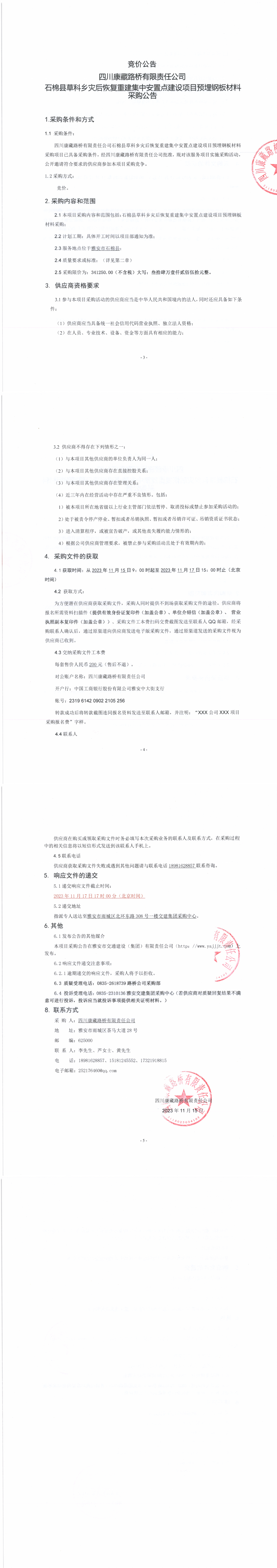 四川康藏路桥有限责任公司石棉县草科乡灾后恢复重建集中安置点建设项目预埋钢板材料采购公告