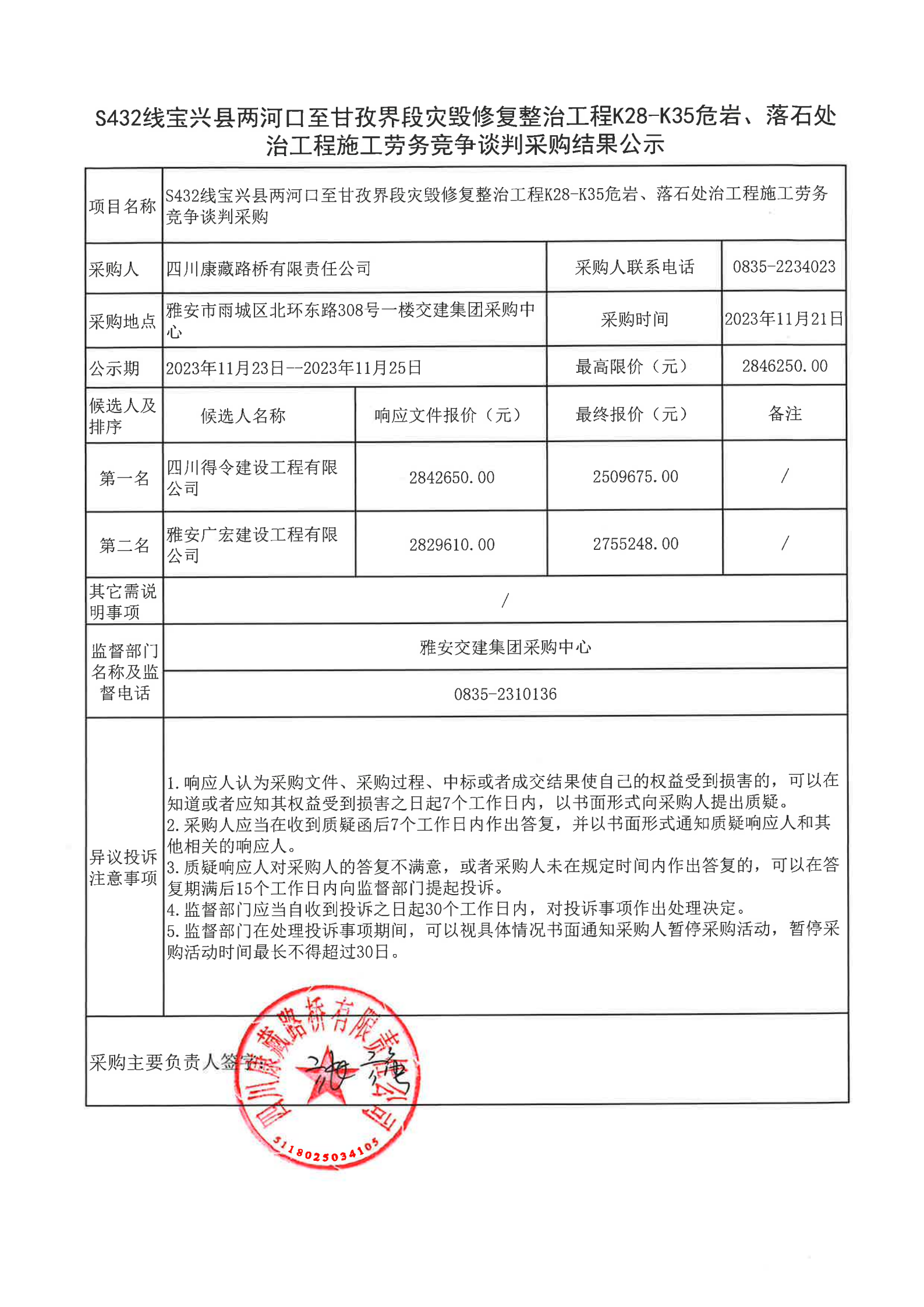 四川康藏路桥有限责任公司S432线宝兴县两河口至甘孜界段灾毁修复整治工程K28-K35危岩、落石处治工程施工劳务竞争谈判采购结果公示