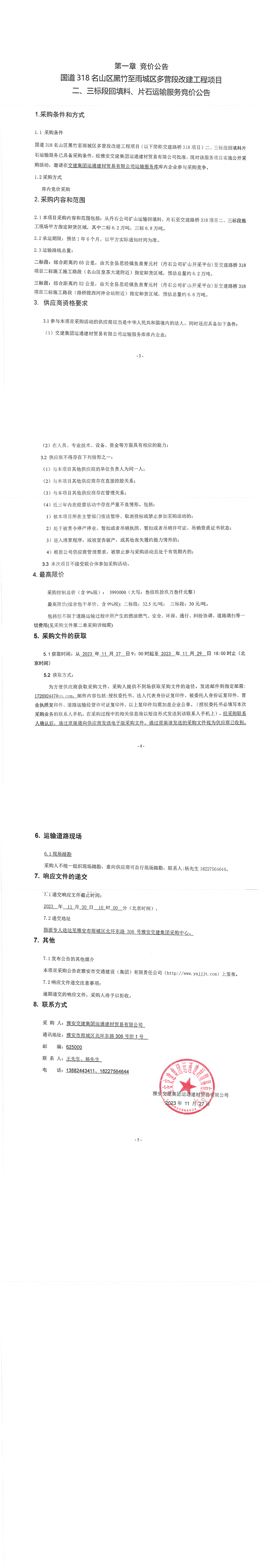 交建集团运通建材贸易有限公司国道318名山区黑竹至雨城区多营段改建工程项目二、三标段回填料、片石运输服务竞价公告