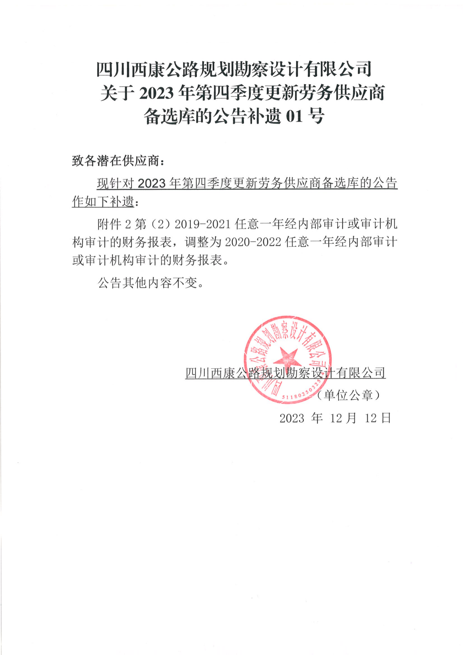 四川西康公路规划勘察设计有限公司关于2023年第四季度更新劳务供应商备选库的公告补遗01号
