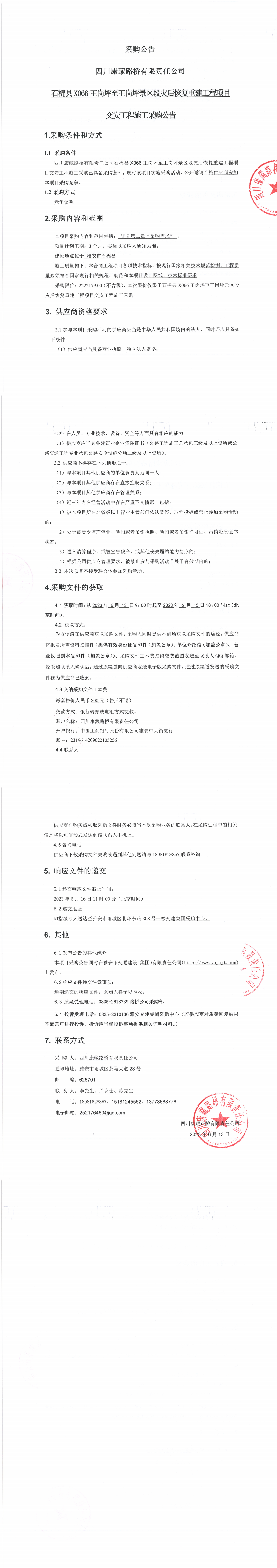 四川康藏路桥有限责任公司石棉县X066王岗坪至王岗坪景区段灾后恢复重建工程项目交安工程施工采购公告