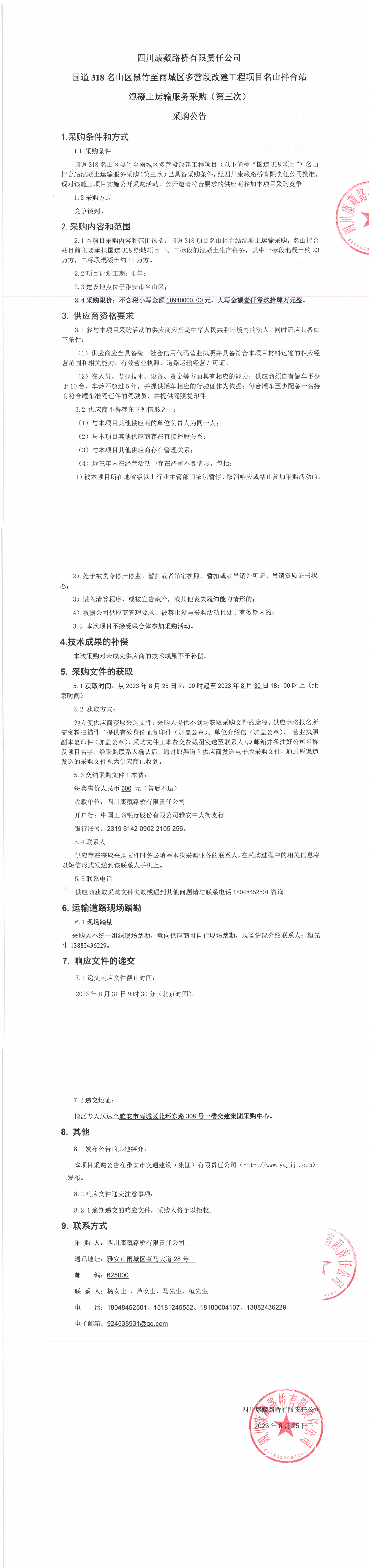 四川康藏路桥有限责任公司国道318名山区黑竹至雨城区多营段改建工程项目名山拌合站混凝土运输服务采购(第三次)采购公告