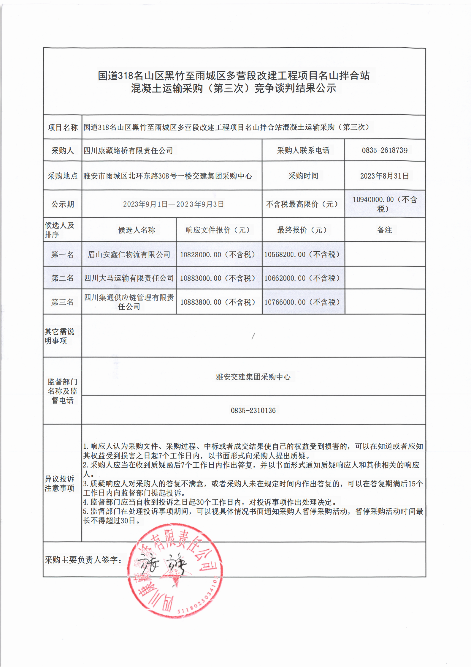 四川康藏路桥有限责任公司国道318名山区黑竹至至雨城区多营段改建工程项目名山拌合站混凝土运输采购(第三次)竞争谈判结果公示