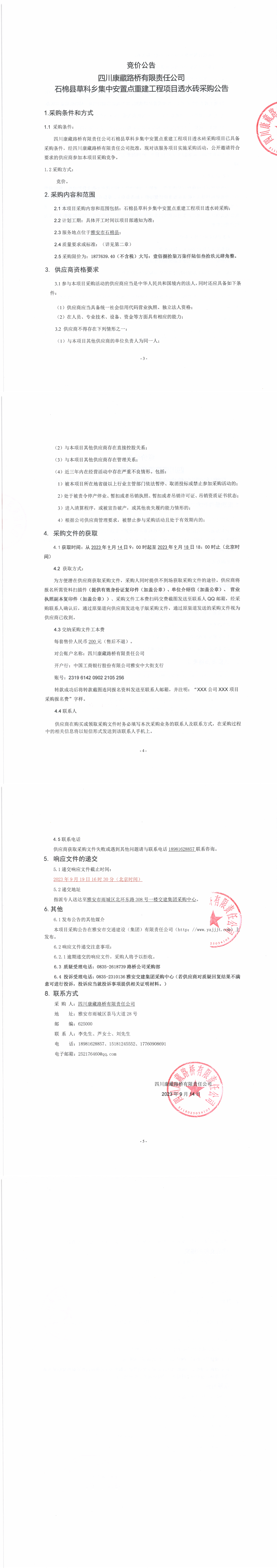 四川康藏路桥有限责任公司石棉县草科乡集中安置点重建工程项目透水砖采购公告