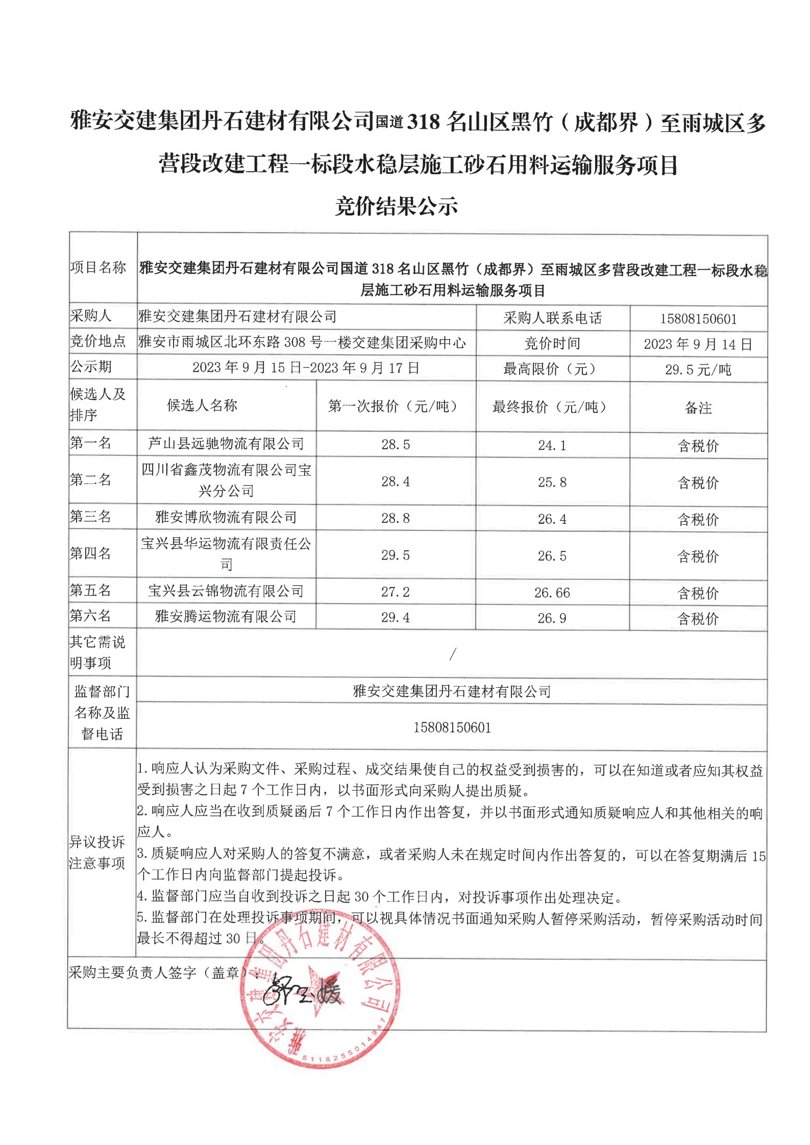 币游集团丹石建材有限公司国道318名山区黑竹(成都界)至雨城区多营段改建工程一标段水稳层施工砂石用料运输服务项目竞价结果公示