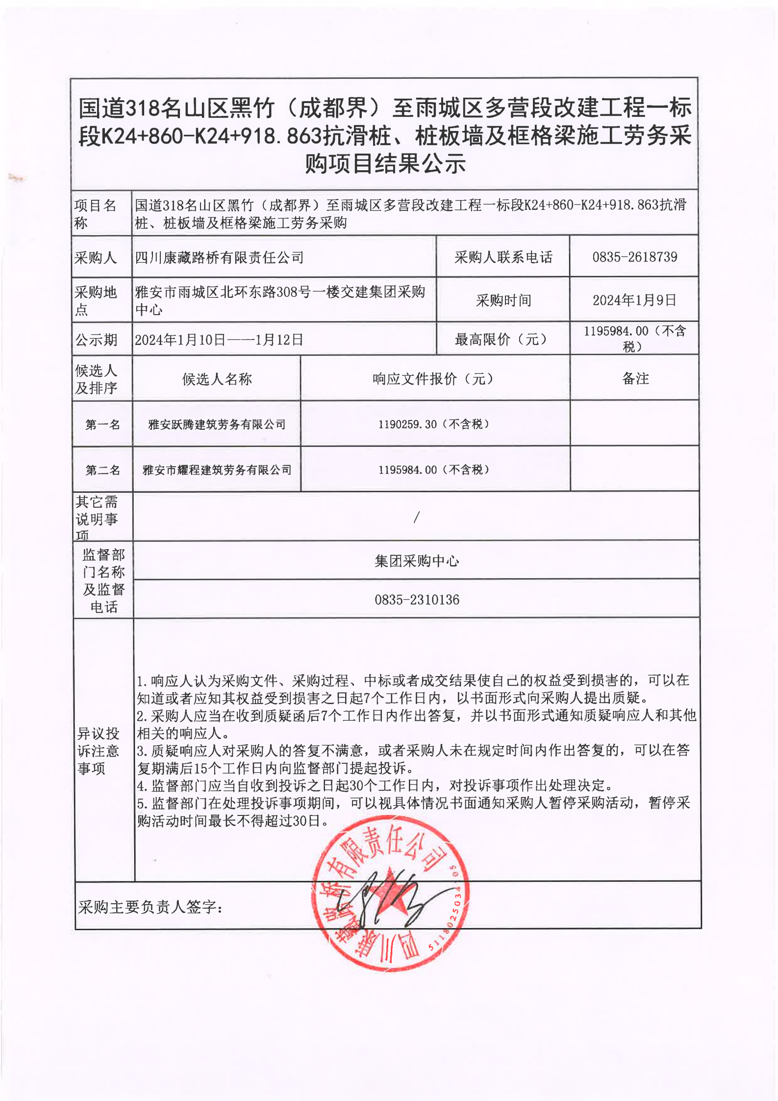 四川康藏路桥有限责任公司国道318名山区黑竹(成都界)至雨城区多营段改建工程一标段K24+860-K24+918.863抗滑桩、桩板墙及框格梁施工劳务采购项目结果公示