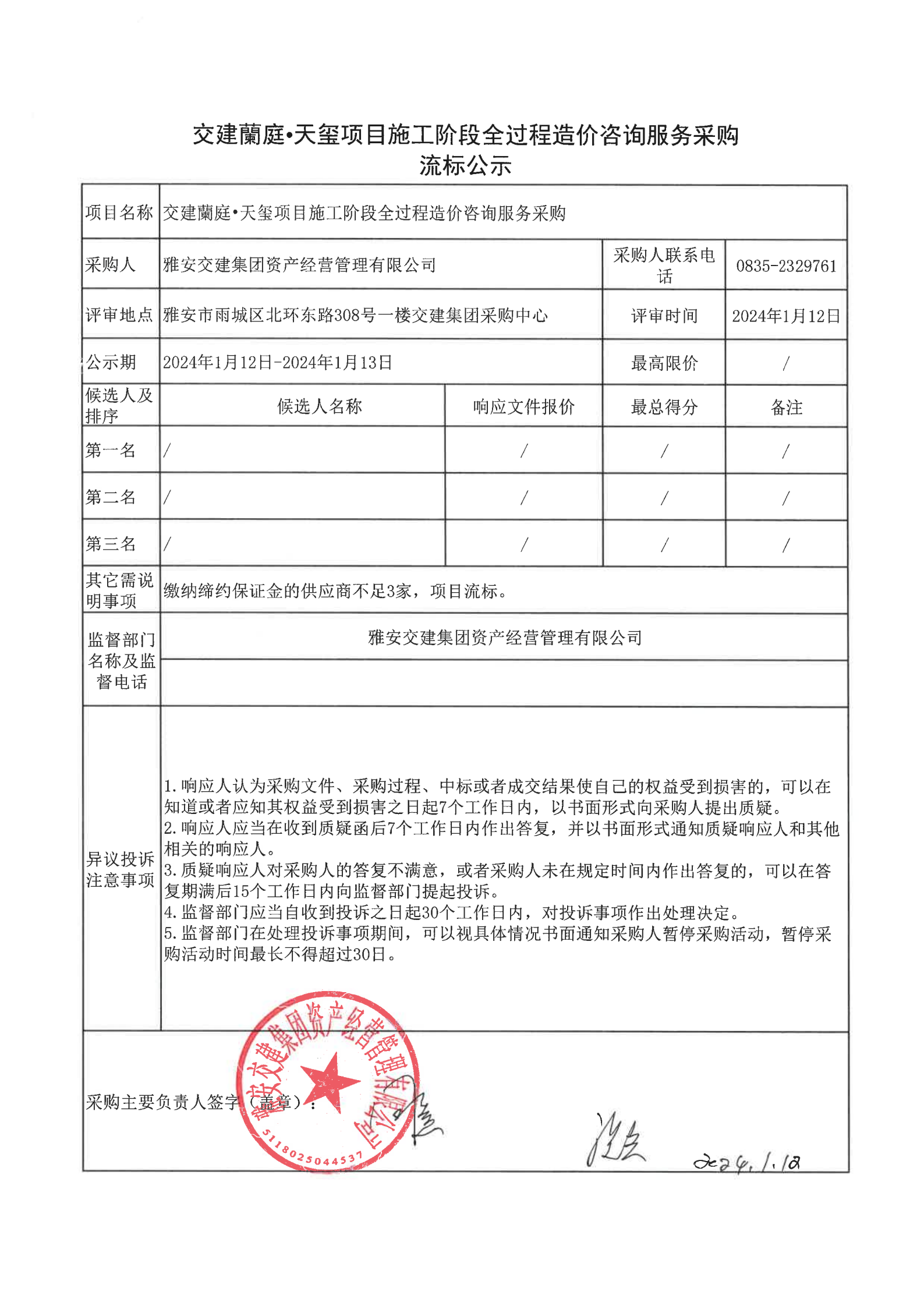 币游集团资产经营管理有限公司交建蘭庭·天玺项目施工阶段全过程造价咨询服务采购流标公示