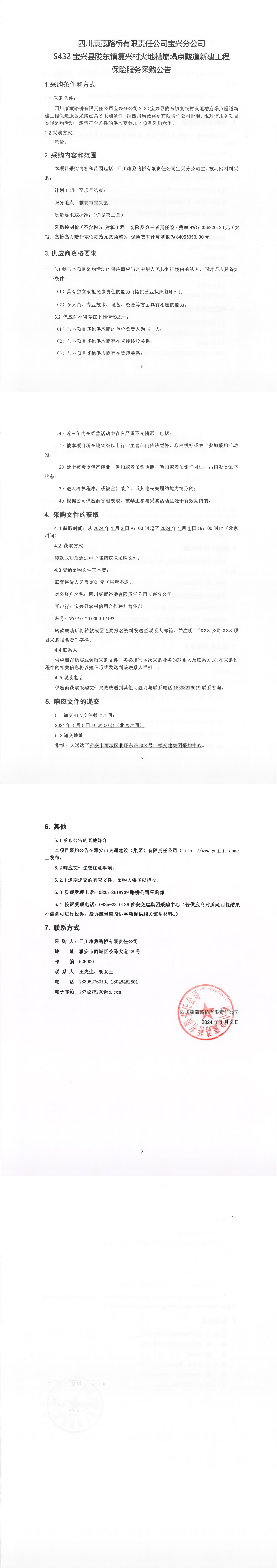 四川康藏路桥有限责任公司宝兴分公司S432宝兴县陇东镇复兴村火地槽崩塌点隧道新建工程保险服务采购公告