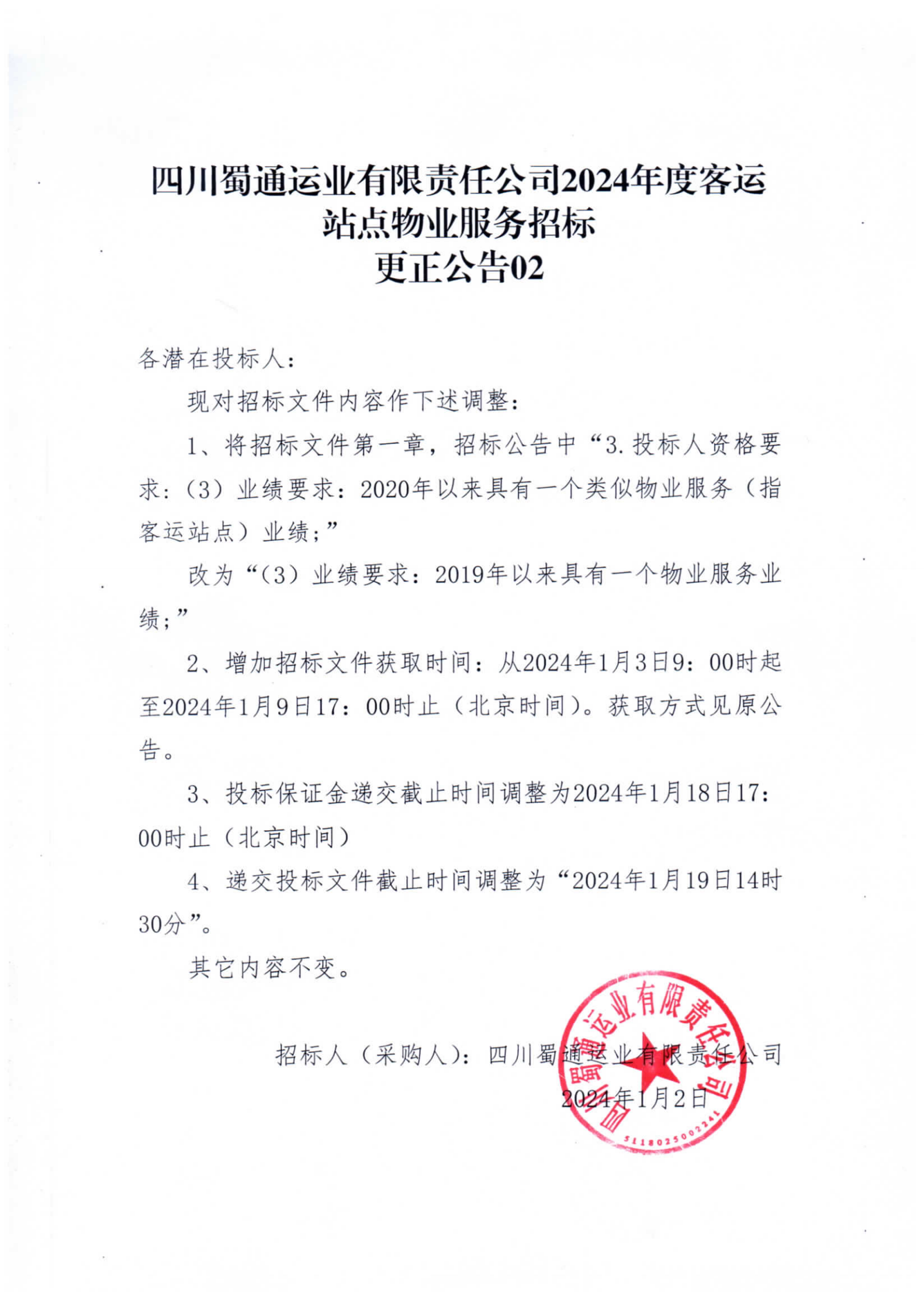 四川蜀通运业有限责任公司2024年度客运站点物业服务招标更正公告02