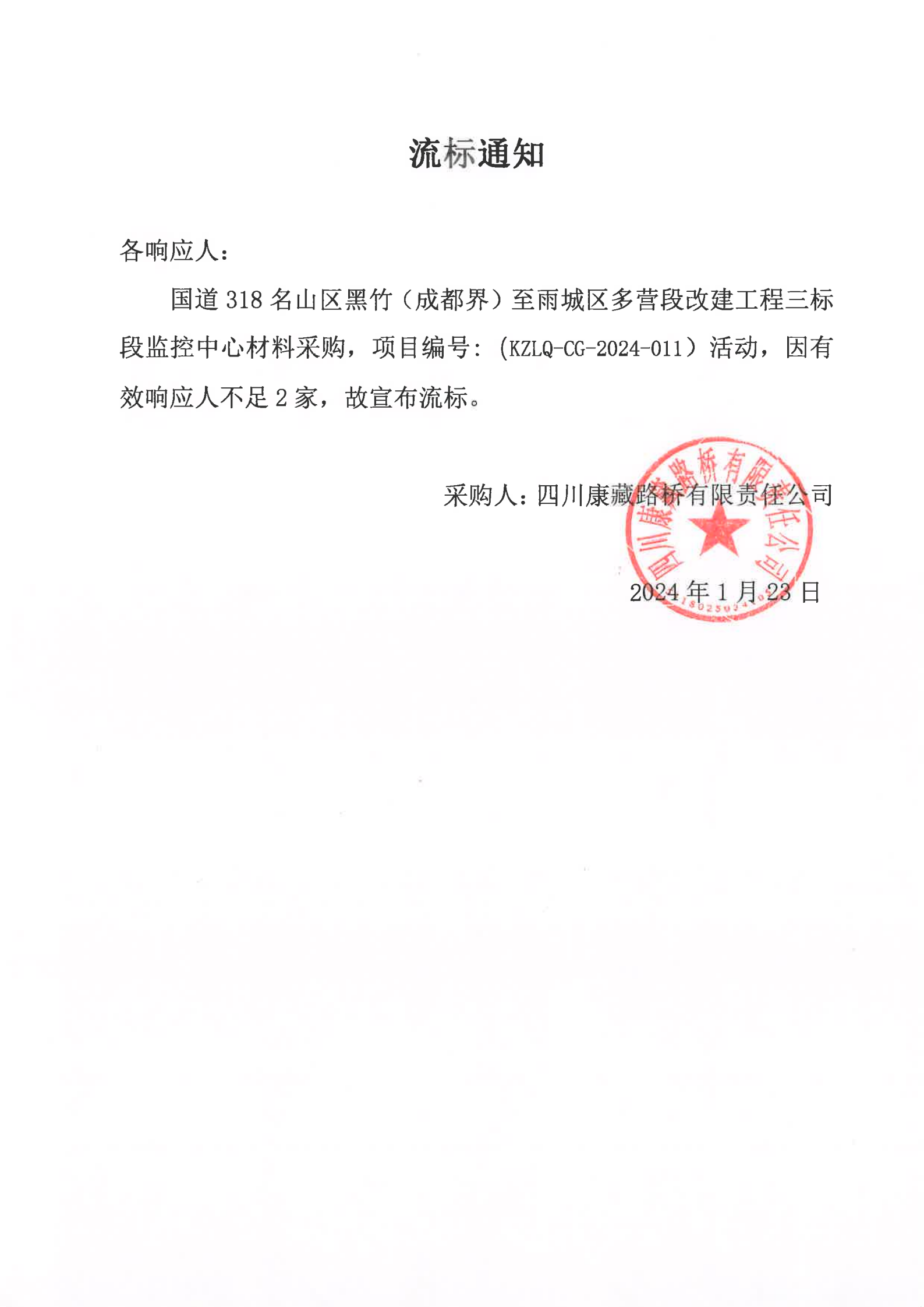 四川康藏路桥有限责任公司国道318名山区黑竹(成都界)至雨城区多营段改建工程三标段监控中心材料采购流标通知