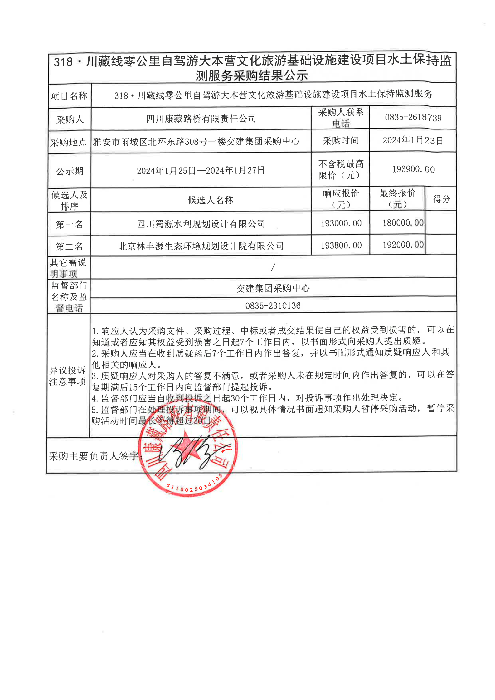 四川康藏路桥有限责任公司318·川藏线零公里自驾游大本营文化旅游基础设施建设项目水土保持监测服务采购结果公示