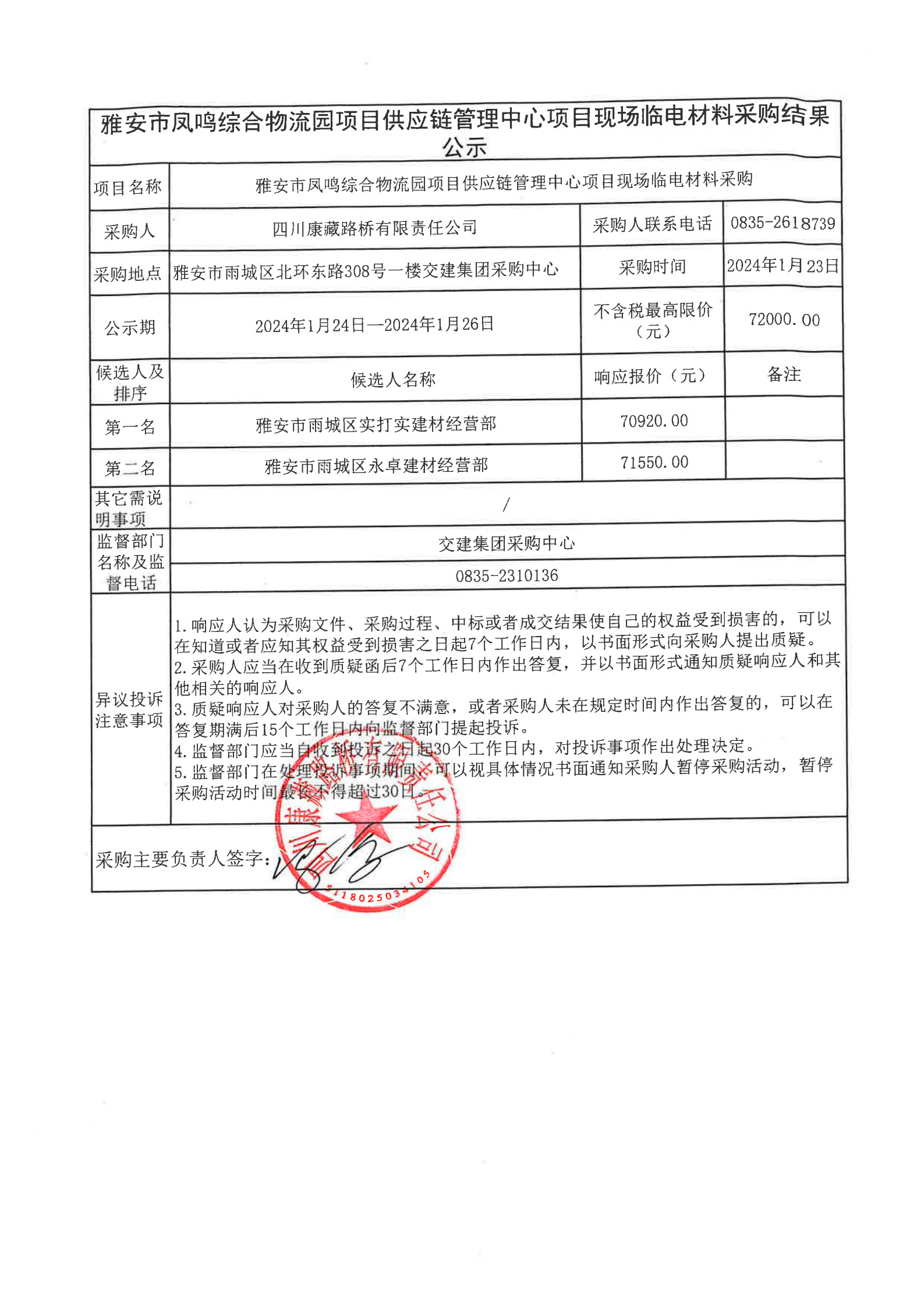 四川康藏路桥有限责任公司雅安市凤鸣综合物流园项目供应链管理中心项目现场临电材料采购结果公示