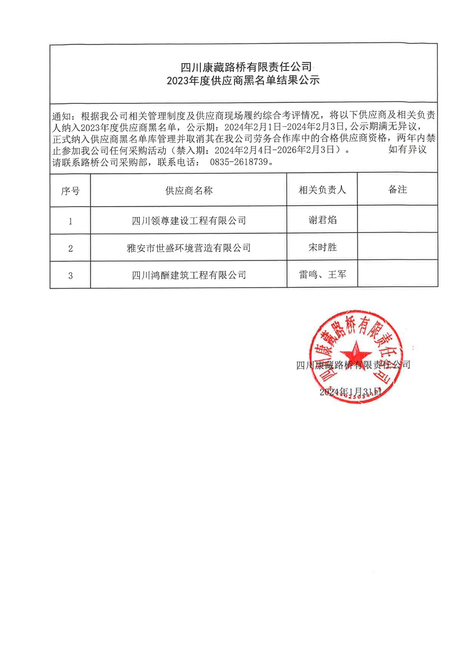 四川康藏路桥有限责任公司2023年度供应商黑名单结果公示