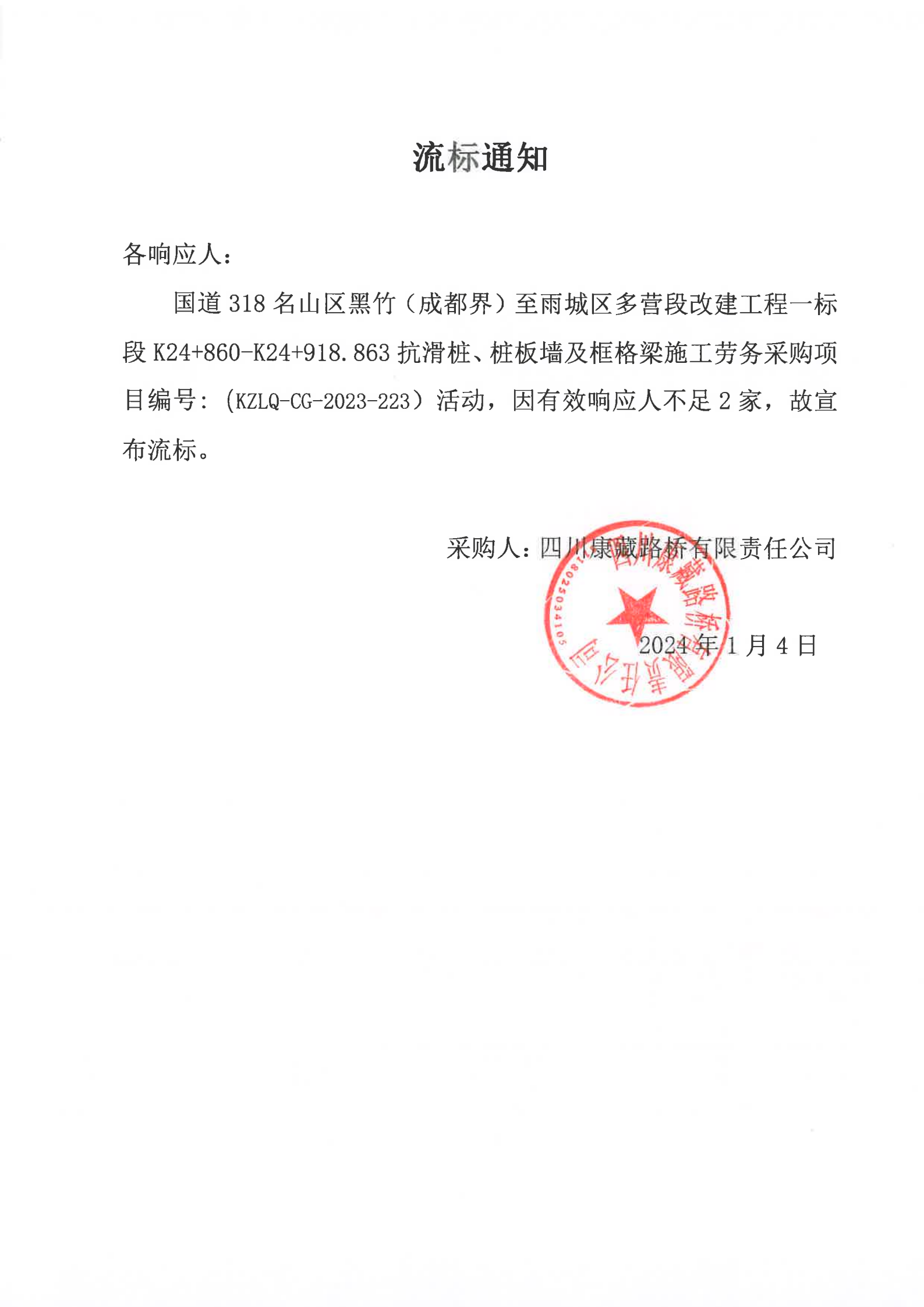 四川康藏路桥有限责任公司国道318名山区黑竹(成都界)至雨城区多营段改建工程一标段K24+860-K24+918.863抗滑桩、桩板墙及框格梁施工劳务采购项目流标通知