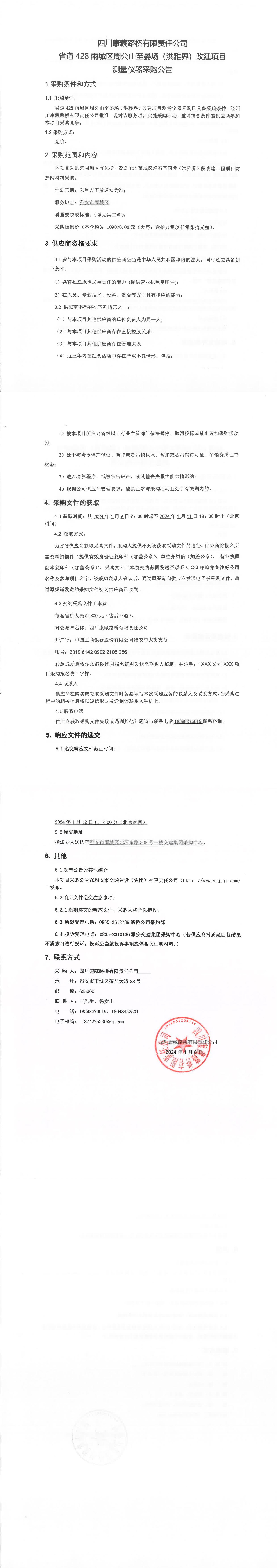 四川康藏路桥有限责任公司省道428雨城区周公山至晏场(洪雅界)改建项目测量仪器采购公告