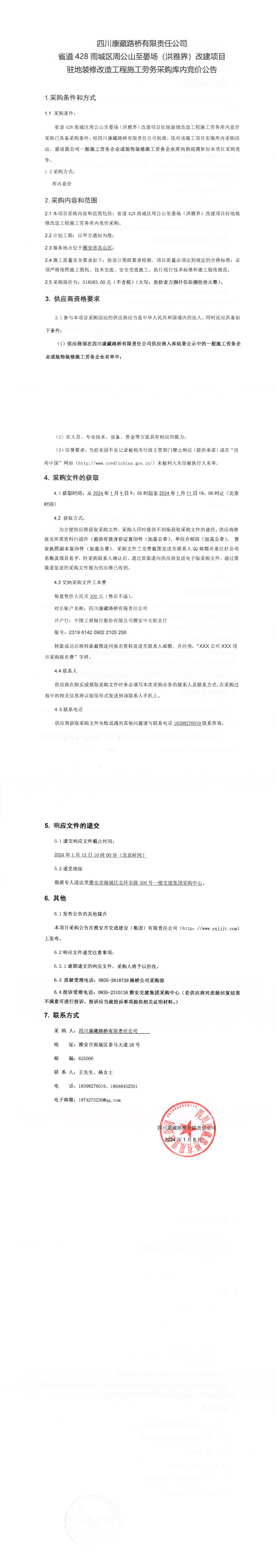 四川康藏路桥有限责任公司省道428雨城区周公山至晏场(洪雅界)改建项目驻地装修改造工程施工劳务采购库内竞价公告