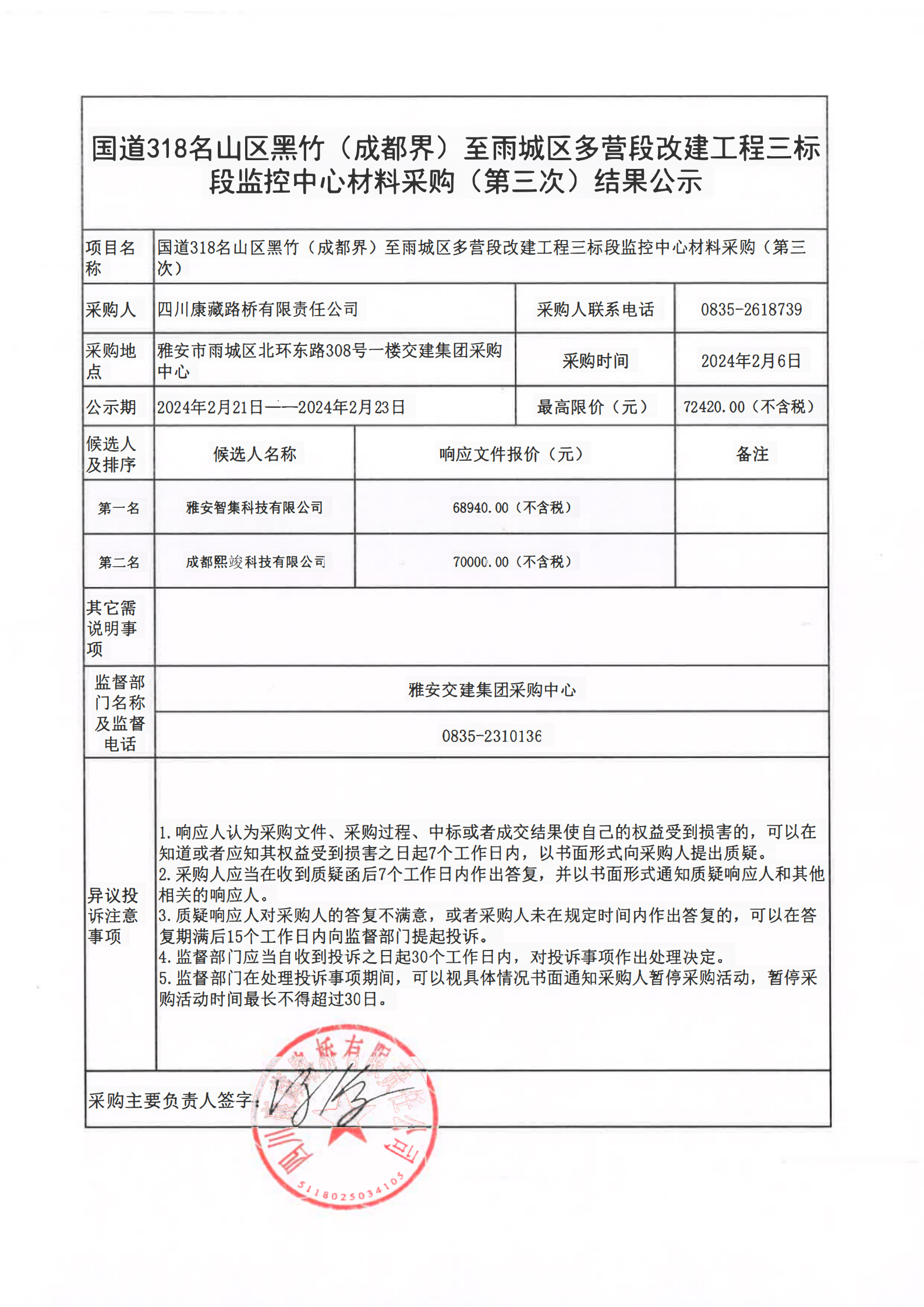 四川康藏路桥有限责任公司国道318名山区黑竹(成都界)至雨城区多营段改建工程三标段监控中心材料采购(第三次)结果公示