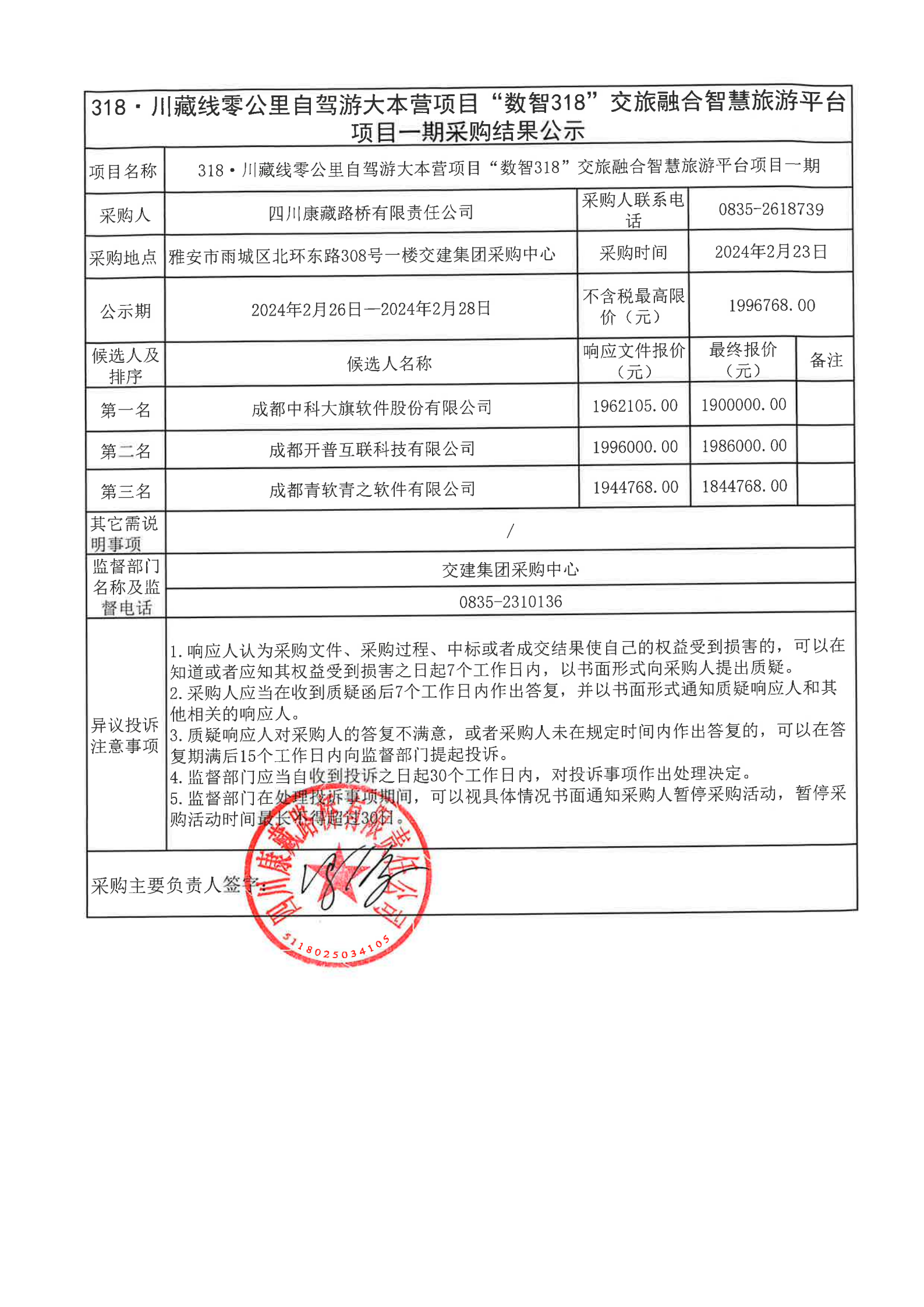 四川康藏路桥有限责任公司318·川藏公路零公里自驾游大本营项目“数智318”交旅融合智慧旅游平台项目一期采购结果公示