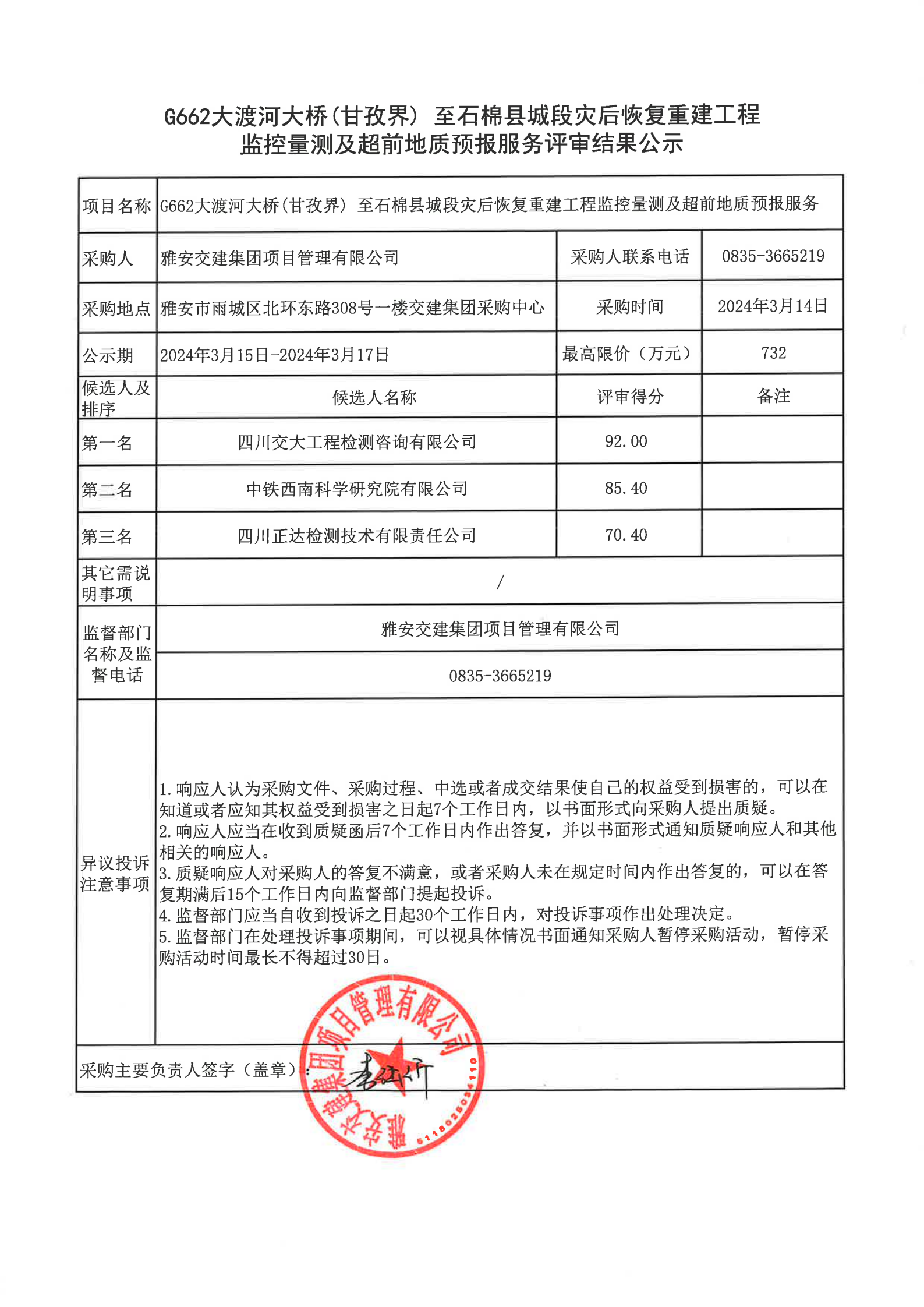 币游集团项目管理有限公司G662大渡河大桥(甘孜界)至石棉县城段灾后恢复重建工程监控量测及超前地质预报服务评审结果公示