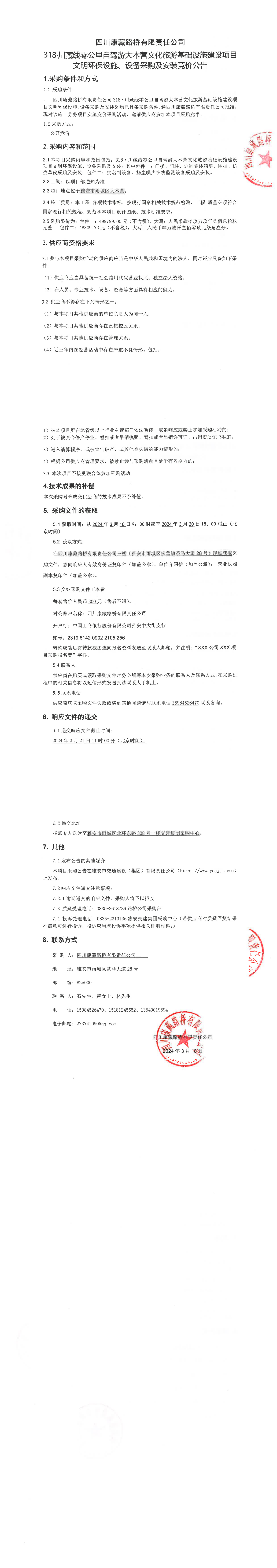 四川康藏路桥有限责任公司318·川藏公路零公里自驾游大本营文化旅游基础设施建设项目文明环保设施、设备采购及安装竞价公告