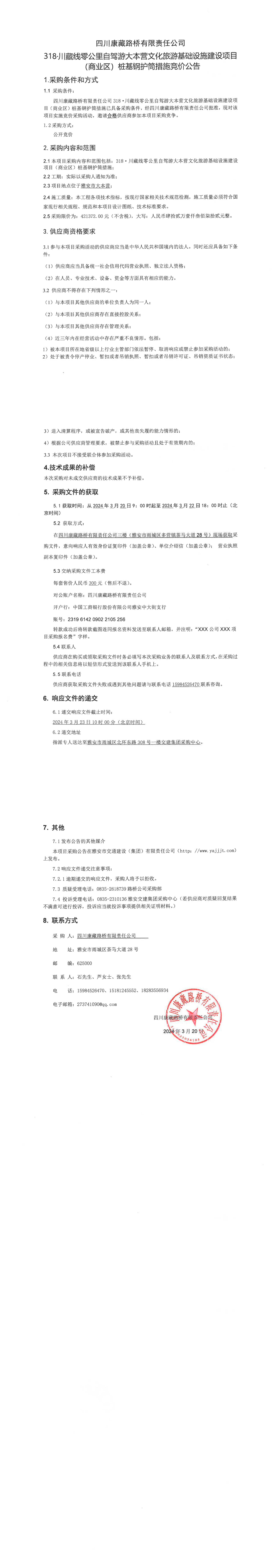 四川康藏路桥有限责任公司318·川藏公路零公里自驾游大本营文化旅游基础设施建设项目(商业区)桩基钢护筒措施竞价公告