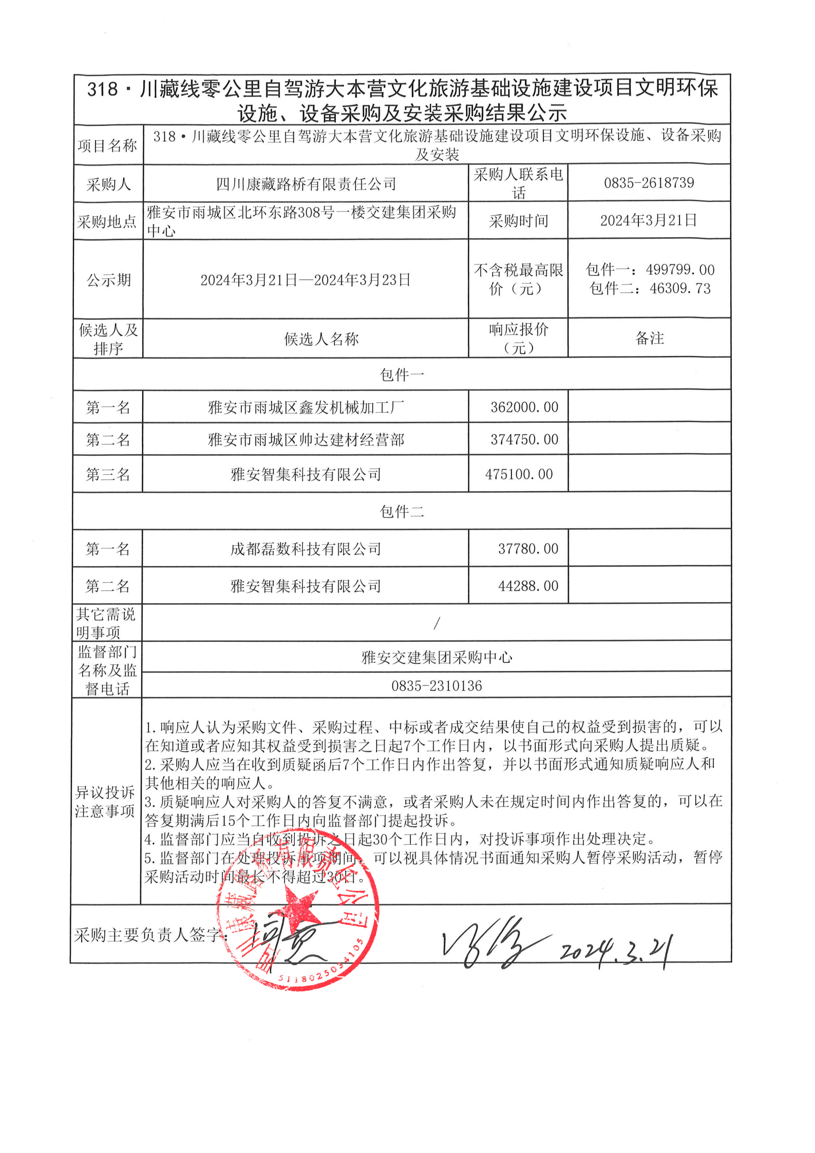 四川康藏路桥有限责任公司318·川藏线零公里自驾游大本营文化旅游基础设施建设项目文明环保设施、设备采购及安装采购结果公示
