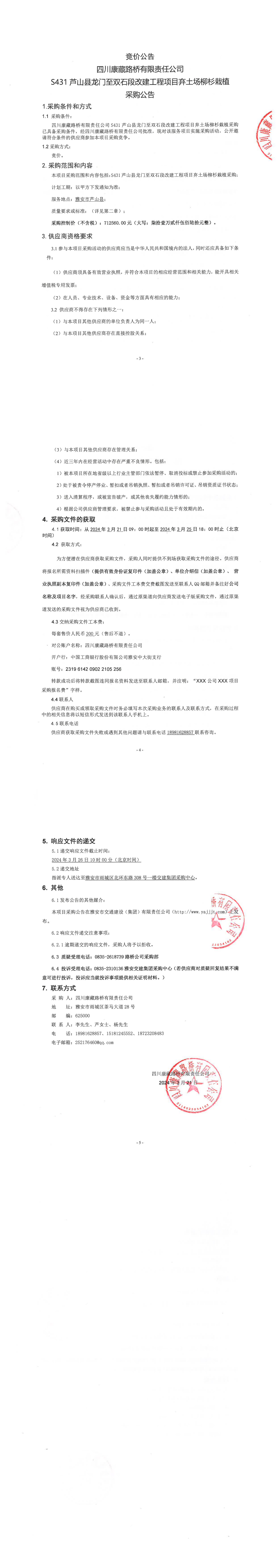 四川康藏路桥有限责任公司S431芦山县龙门至双石段改建工程项目弃土场柳杉栽植采购公告