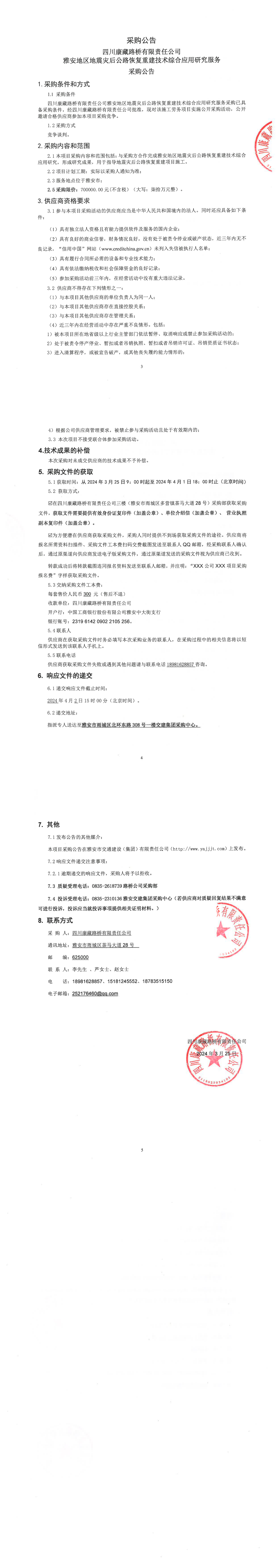 四川康藏路桥有限责任公司雅安地区地震灾后公路恢复重建技术综合应用研究服务采购公告