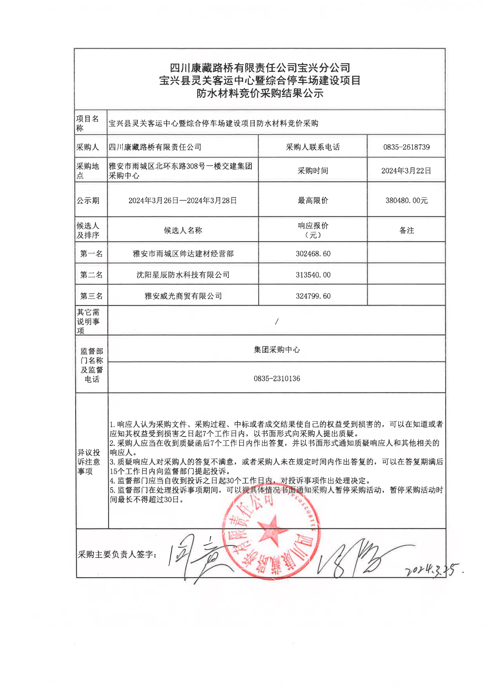 四川康藏路桥有限责任公司宝兴县灵关客运中心暨综合停车场建设项目防水材料竞价采购结果公示