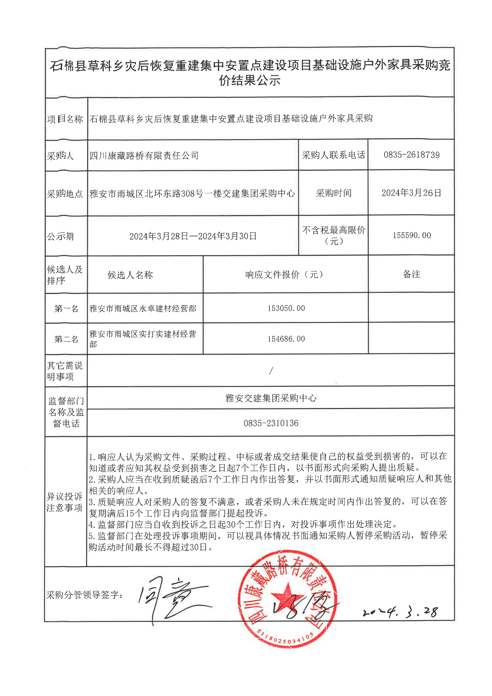 四川康藏路桥有限责任公司石棉县草科乡灾后恢复重建集中安置点建设项目基础设施户外家具采购竞价结果公示