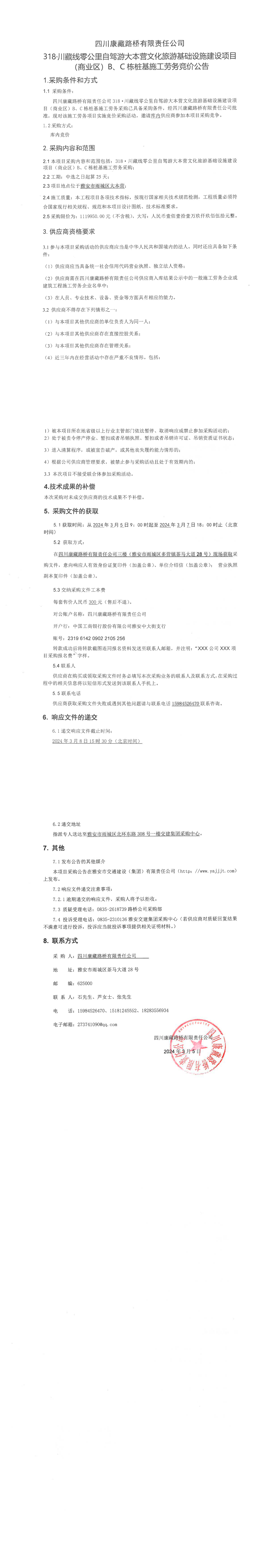 四川康藏路桥有限责任公司318·川藏公路零公里自驾游大本营文化旅游基础设施建设项目(商业区)B\C栋桩基施工劳务竞价公告