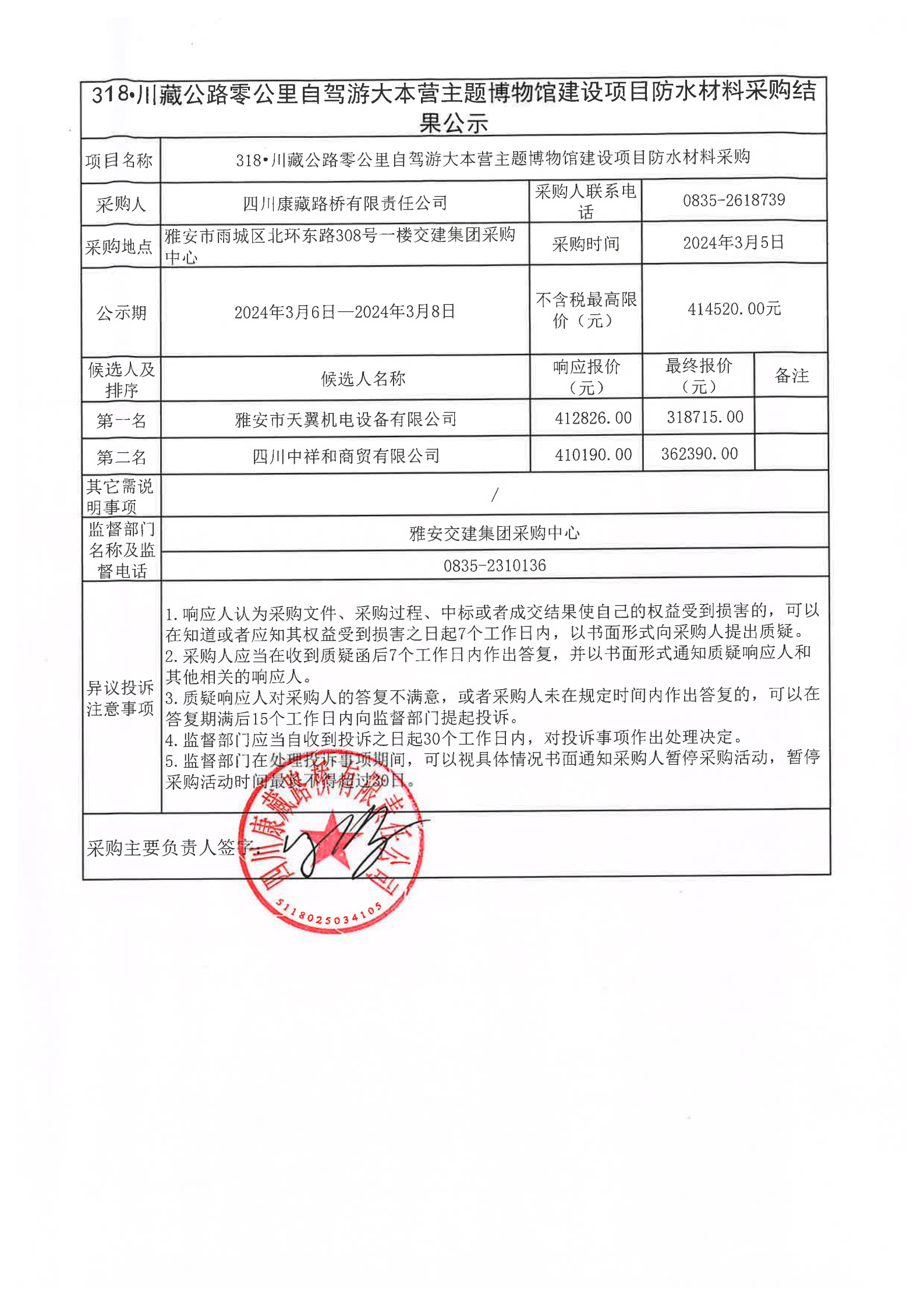 四川康藏路桥有限责任公司318·川藏公路零公里自驾游大本营主题博物馆建设项目防水材料采购结果公示