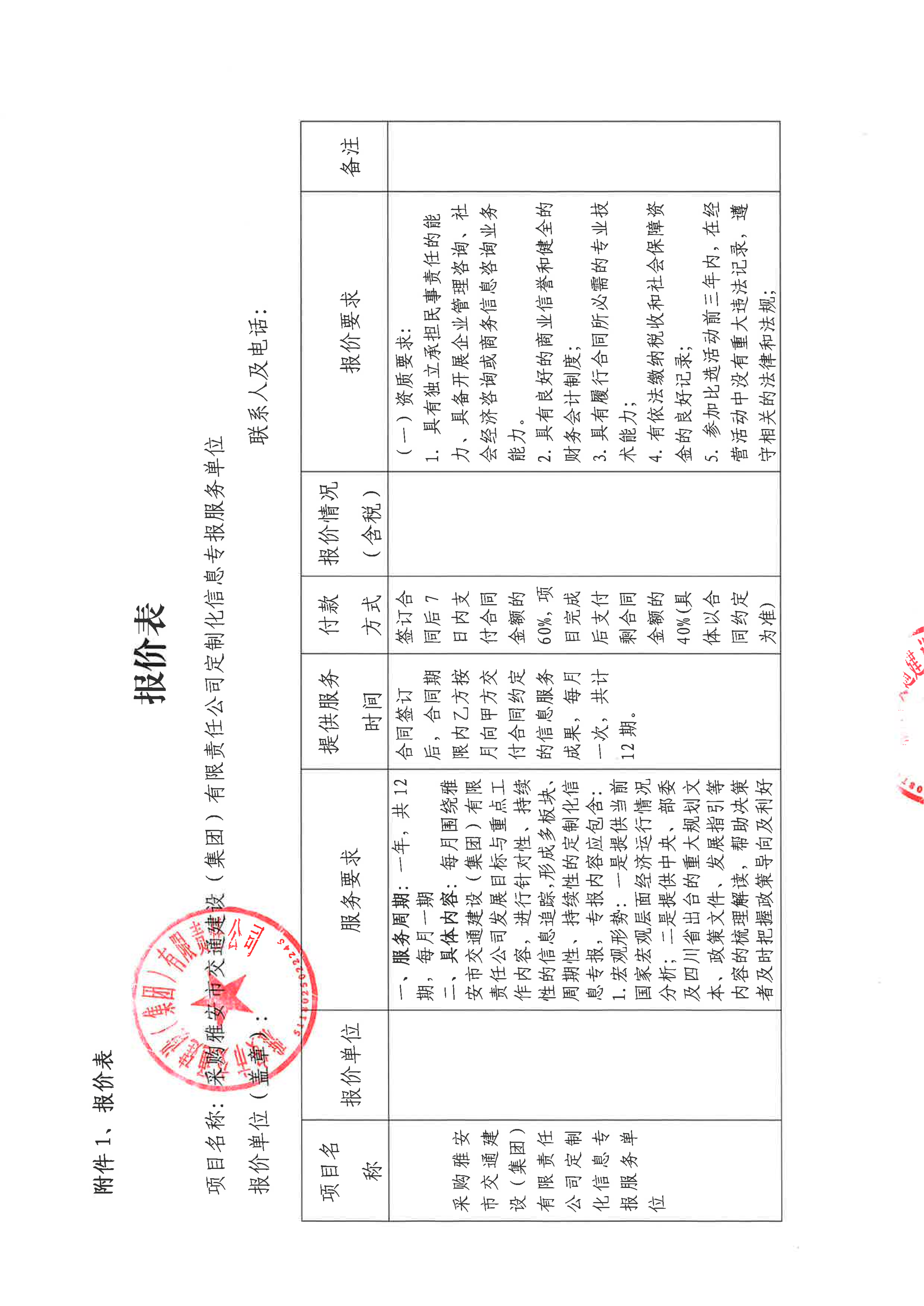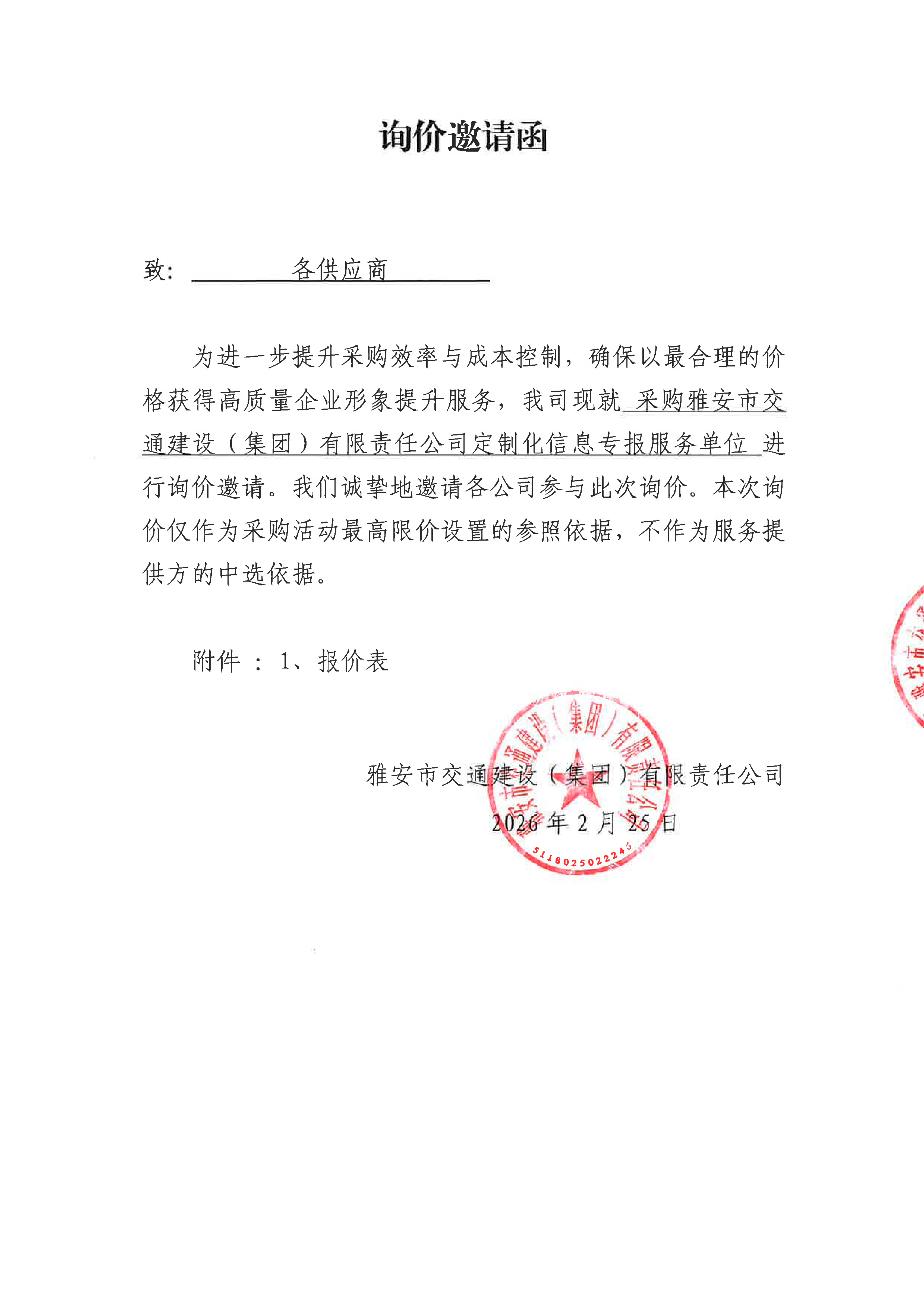 关于雅安市交通建设(集团)有限责任公司定制化信息专报服务采购限价的询价函